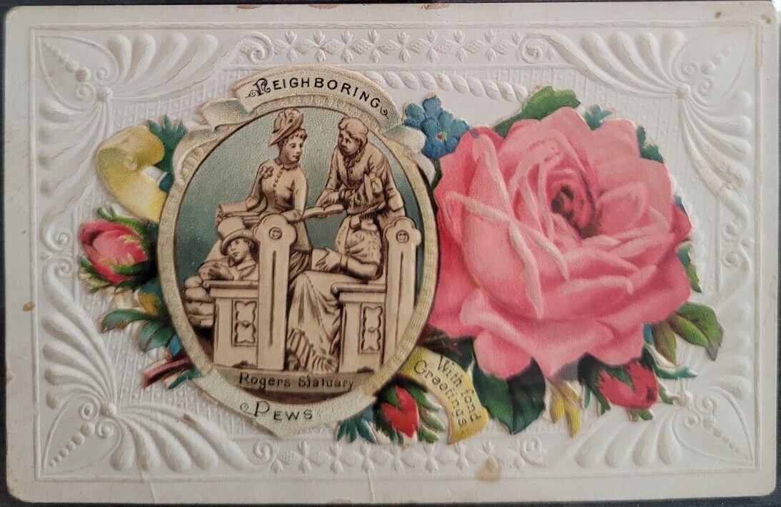 During Rogers’ career, it was not uncommon for a visitor to another’s home or office to present an engraved "calling card" to the butler or other greeter announcing the visitor’s arrival. There were thousands of different pictures available for the front of the cards, including a number that portrayed Rogers statues. The card usually had a rendition of a particular Rogers Group, surrounded by flowers. Upon lifting the floral cover, which was hinged to a larger back card, the name of the visitor would be inscribed on the face of the card itself.