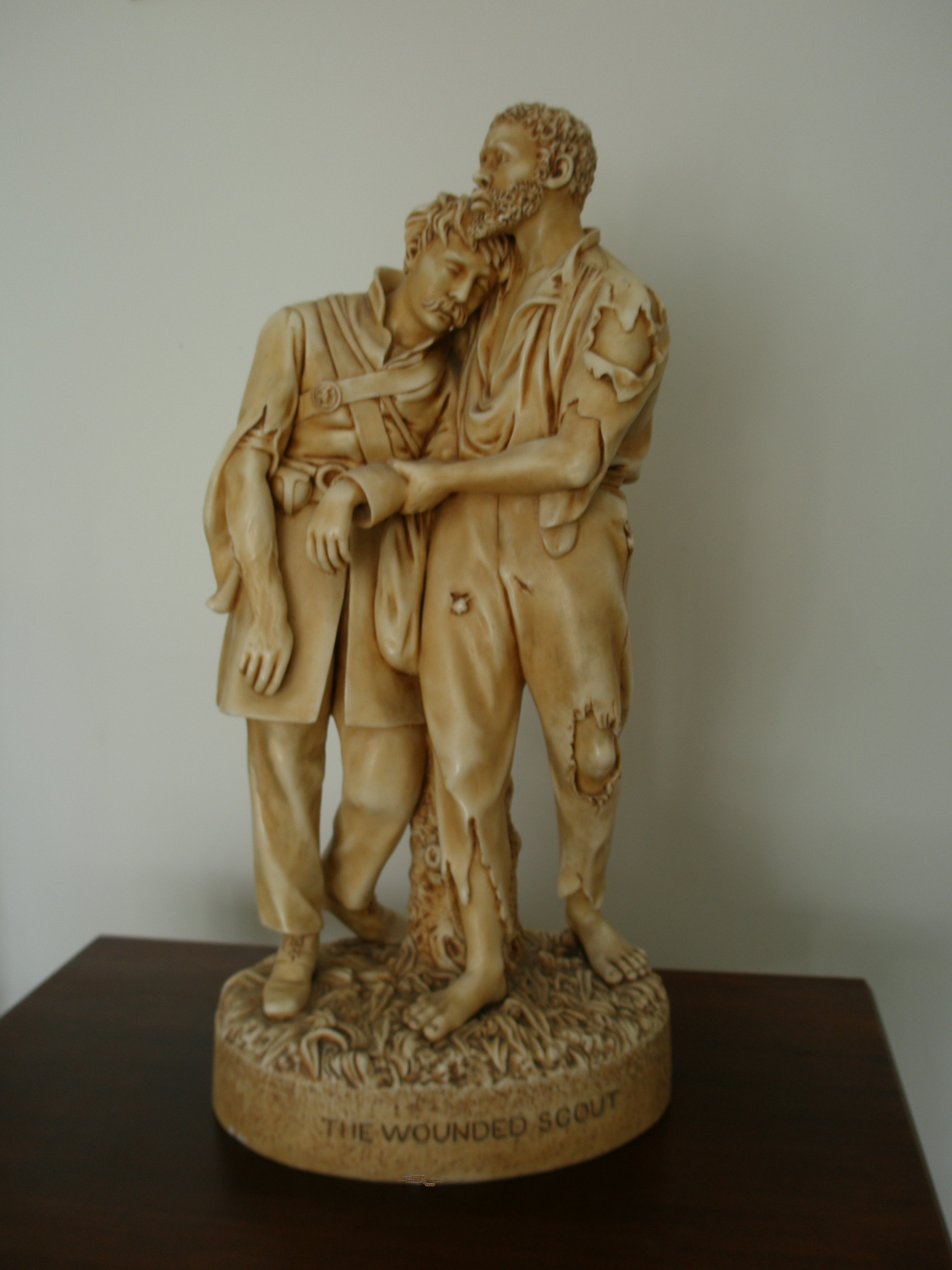 The pieces that have been found in porcelain and majolica include "Taking the Oath and Drawing Rations", "One More Shot" and "The Wounded Scout". The porcelain pieces were primarily a solid off-white color, but frequently they have gold or other colored accents on the bases and skin areas. The majolica pieces were produced in one primary color, such as red, green, beige or brown to replicate a bronze appearance. Pieces done with the beige appearance are frequently referred to as "creamware."