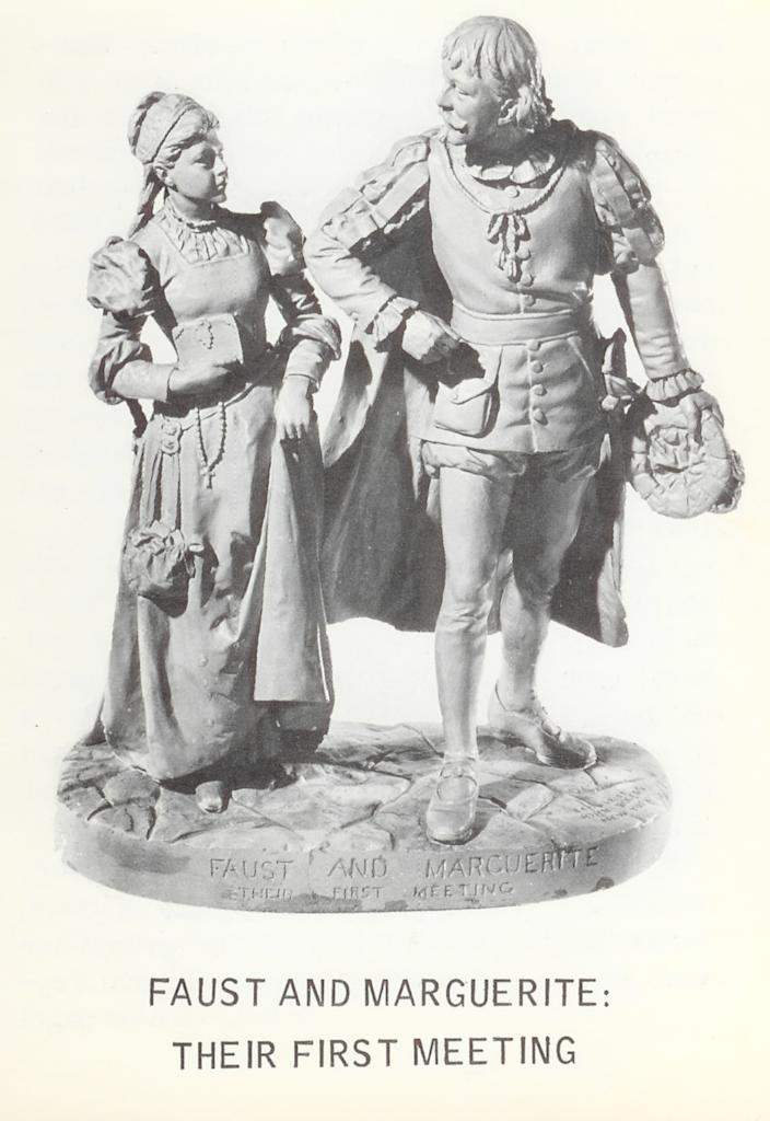 The first in a series of three "Faust and Marguerite" groups taken from "Faust," by Johann Wolfgang von Goethe and the subsequent opera by Charles Francois Gounod, "Their First Meeting" portrays Faust courteously offering to escort Marguerite home, although she has declined his offer. There are two versions of this group. In this version Faust's cape ends mid calf.