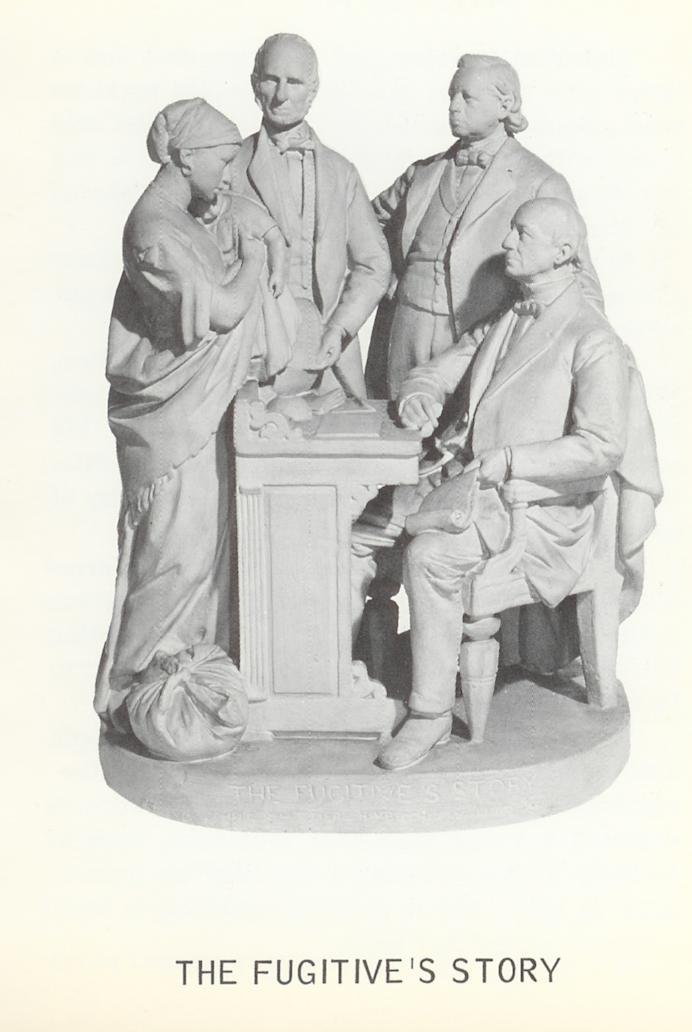 Standing behind the desk are three well-known abolitionists, Rev. Henry Ward Beecher, John Greenleaf Whittier and William Lloyd Garrison. They are listening intently as a slave woman gives her account of her escape through the "underground railway."