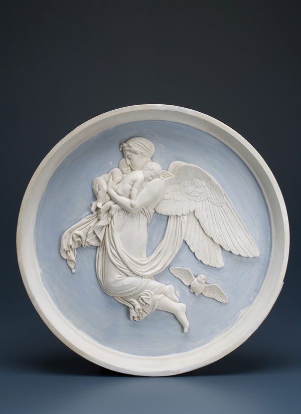 This was Rogers' rendition of the bas-relief medallion "Night" created in 1815 by the great Danish Neoclassicist Berthel Thorwaldsen (1770-1844). Reproductions in plaster, beadwork and other mediums were common in Victorian homes. They were cast with a blue background. It is a companion piece to "Morning."