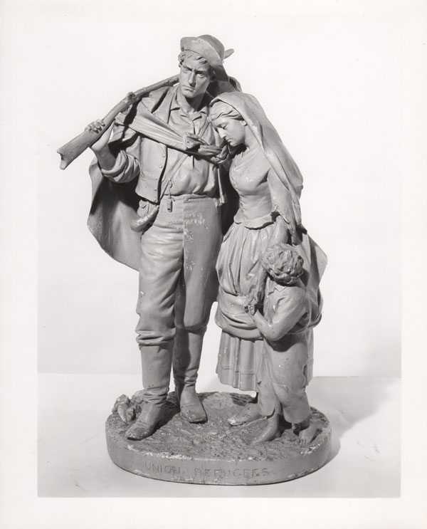 For supporting Northern efforts during the Civil War, this family has been driven from their Southern home by neighbors. The stalwart father carries all their possessions in a bundle and the child offers his mother flowers to try to console her grief. In this version the mother's sleeve stops near her elbow and there are horizontal creases on the man's knee.