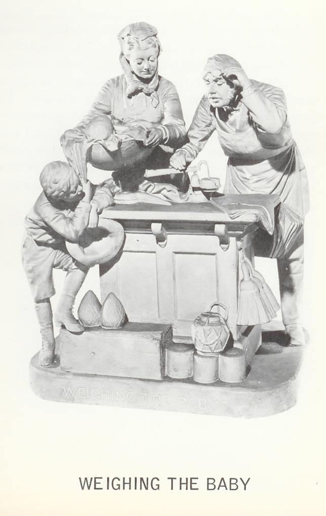 This group portrays a mother who has brought her baby to be weighed on the grocer's scale. She smiles with pride at the high weight, not realizing that the mischievous boy is stealthily tugging at the blanket, causing the phenomenal weight gain.
