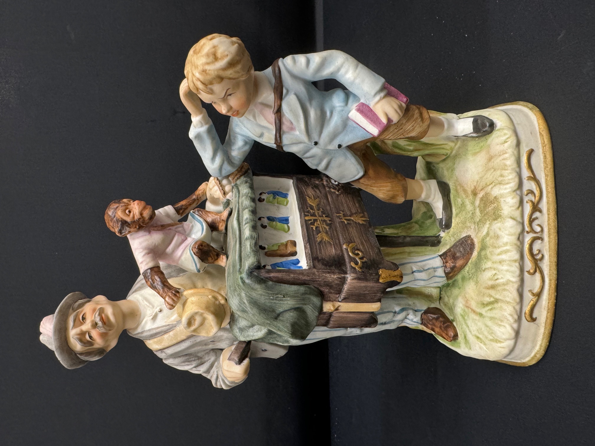 Another version of "School Days" displays a Capodimonte mark. The coloration and base are decidedly different from the UCAGCO version, although the figurine is otherwise substantially the same in terms of composition and other details.