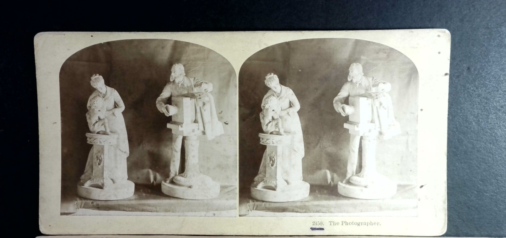 The popularity of The Rogers Group coincided with that of the parlor stereopticon, a regular source of entertainment during the Victorian period. A stereopticon is a slide projector that combines two images to create a three-dimensional effect, and appears to make two images dissolve into one. Between 1867 and 1876 many sets of stereoviews of John Rogers statuary were issued by at least 17 different companies. In total, about 41 different groups were represented, so it is possible to find many views of the same title, each from a different view or perspective unique to the particular company issuing the stereoview.